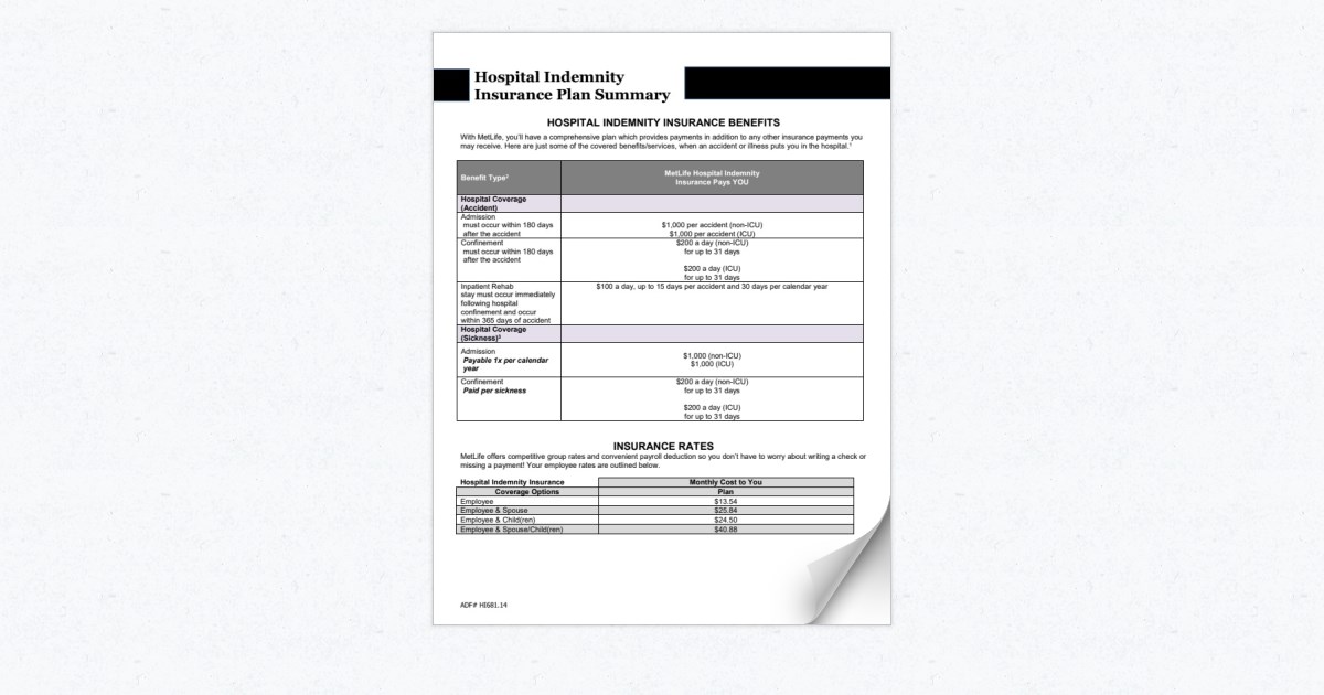 However, with the higher deductibles brought on by the affordable care act, these plans are more likely to be offered at work during your core benefits enrollment alongside critical illness and accident plans. Hospital indemnity insurance complements your medical plan. Metlife’s hospital indemnity insurance may be subject to benefit reductions that begin at age 65.